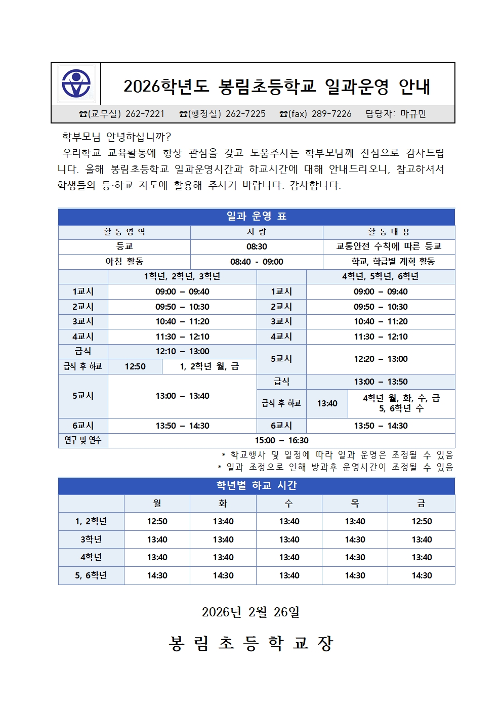 2026학년도 봉림초등학교 일과운영 안내