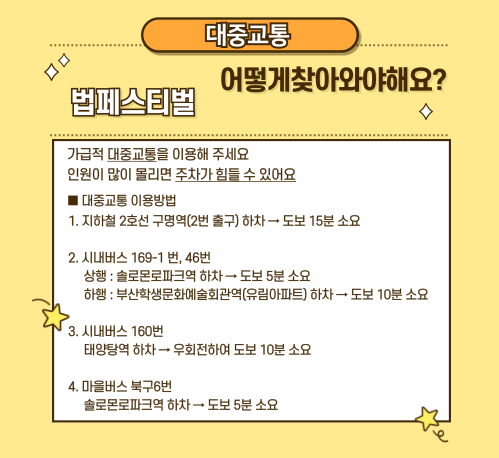 1. 행사명 : 부산솔로몬로파크 '법의 날 기념행사(법 페스티벌)' 2. 일 시 : 2025. 4. 19.(토) 10:00 ~ 17:00 3. 행사장소 : 부산솔로몬로파크 (부산시 북구 낙동북로 755) 4. 행사내용 - 6개 법체험관 운영(모의법정, 과학수사, 모의국무회의, 모의국회, 선거체험, 헌법배움터) - 북부경찰서, 북부소방서 협업 경찰, 소방 체험 - 구포어린이교통공원 홍보부스 운영(안전우산 만들기) - 법 마술쇼, 법 골든벨, 학생밴드버스킹 등 공연/참여형 프로그램 기획 - 법 상징 페이스페인팅, 네일아트, 스노우볼, 테라리움 등 체험 8종 운영 - 자유관람객 법탐험지 활동(각종 기념품 증정) 5. 기타 - 참여 비용 무료, 행사 기념품 증정(보조배터리, 물병 등) - 각종 프로그램은 사전신청(네이버 예약, 포스터/인스타그램 참조)을 우선으로 하며, 예약인원 부족 시 현장접수 병행