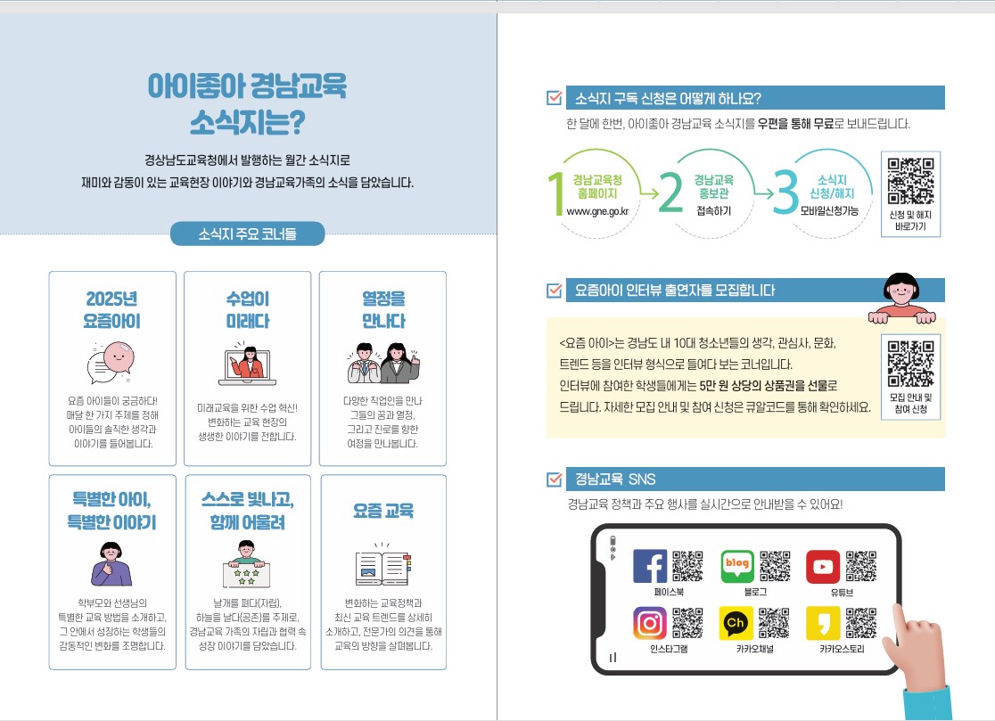 **『아이좋아 경남교육』이란? 다양한 경남교육소식과 현장 이야기를 담아낸 월간 교육 소식지입니다. 매월 1회 발행하며 구독 신청 희망자에 한해 우편으로 배송해 드립니다. 또한, 메일링 서비스와 웹진을 통해 인터넷(모바일)으로도 편하게 보실 수 있습니다. 별도 비용 없이 2년간 “무료”로 배부되오니, 경남교육 주요 정책과 학교현장의 소식 등을 알차게 만나보세요.
